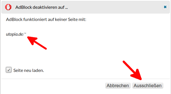 Dort findest du einen Schieberegler. Klicke darauf, um Adblock Plus auf Utopia.de zu deaktivieren.