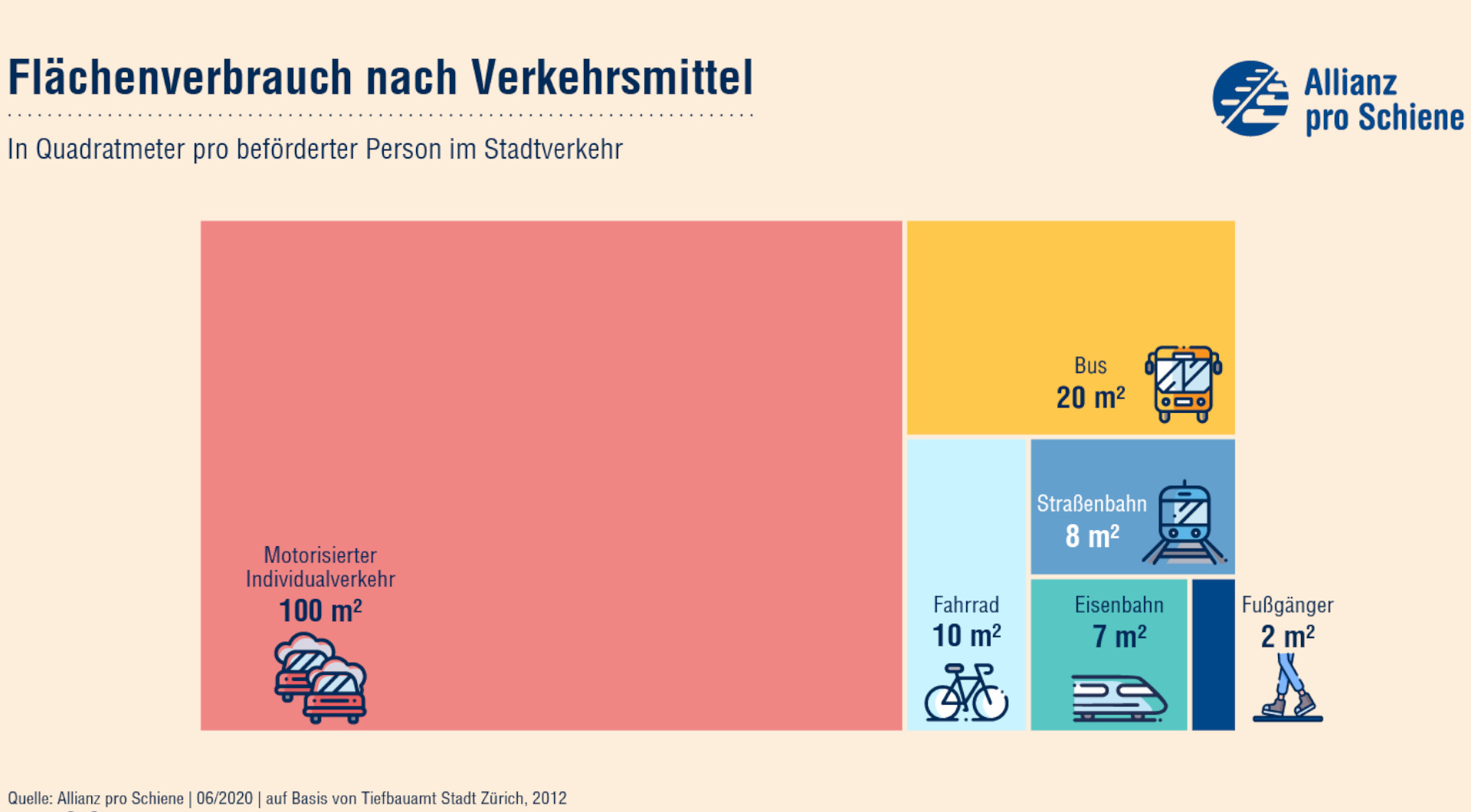 Die Grafik berücksichtigt die Flächen, die die Verkehrsmittel zum Befördern und Abstellen benötigen. Die Datengrundlage stammt vom Tiefbauamt der Stadt Zürich. Dass die Unterschiede beim Flächenverbrauch so riesig sind, hat mehrere Gründe: Autos werden häufig nur von einer Person gefahren, brauchen aber dennoch viel Platz auf der Straße und auch zum Parken. Busse, Straßenbahnen und die Eisenbahn dagegen können sehr viele Fahrgäste auf vergleichsweise kleiner Fläche befördern.